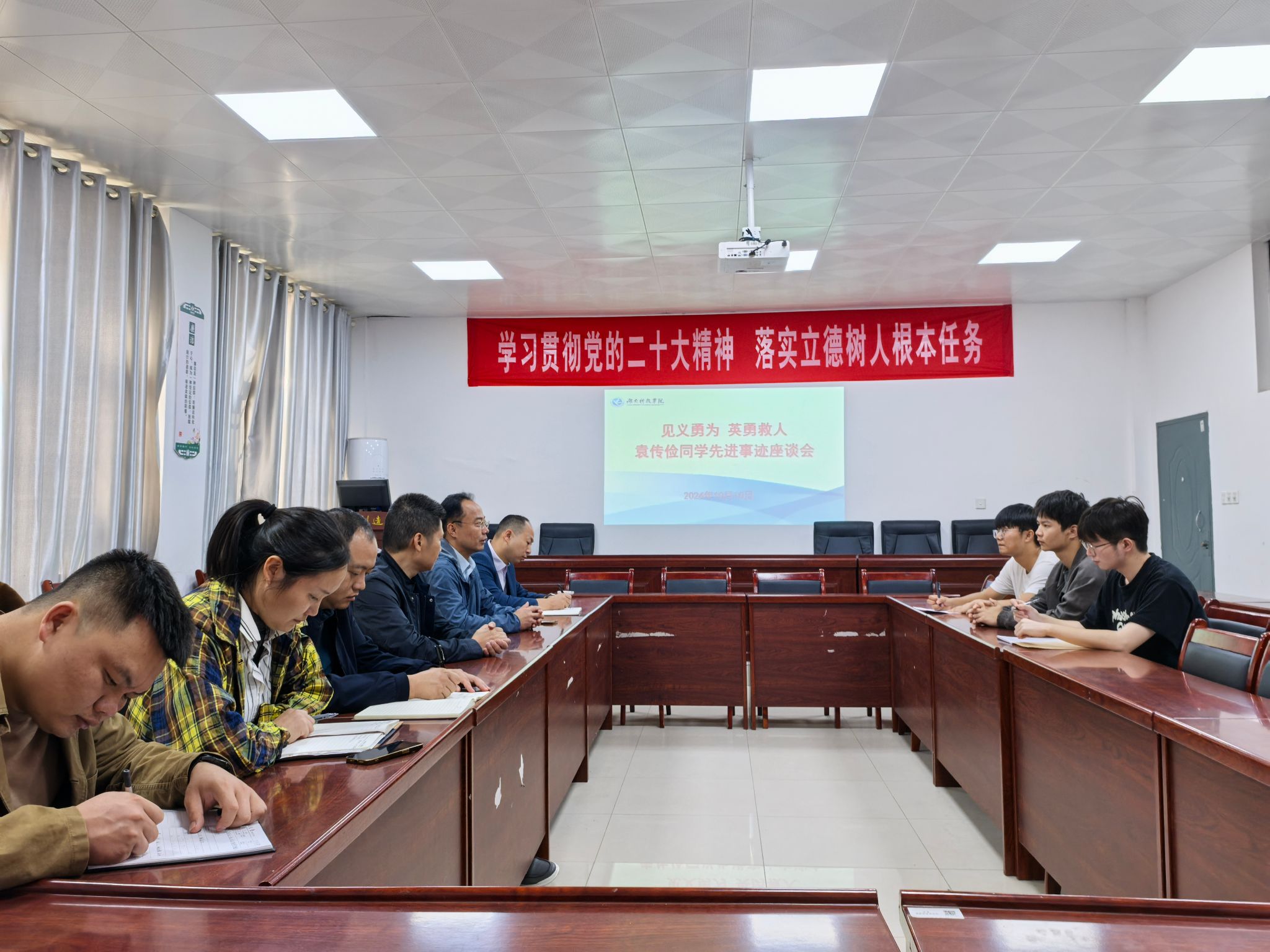 会上,学院党总支书记杨攀对袁传俭同学“见义勇为,英勇救人”的行为和事迹给予了高度赞扬,表扬他用实际行动诠释了当代大学生的责任与担任,为社会传递了正能量。院长谭永宏为袁传俭同学颁发纪念品,鼓励他继续努力,发扬好“德才兼备、自强不息”的校训精神。袁传俭同学感谢学校、学院和社会各界的赞誉,表示将继续弘扬见义勇为、乐于助人的精神,尽自己所能服务他人。