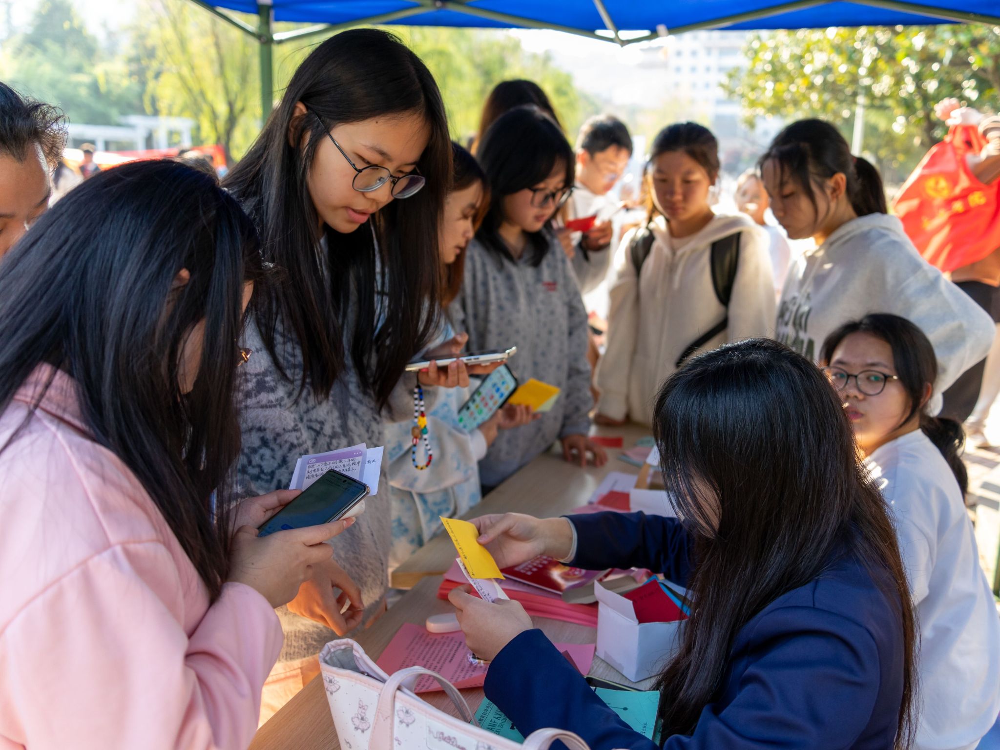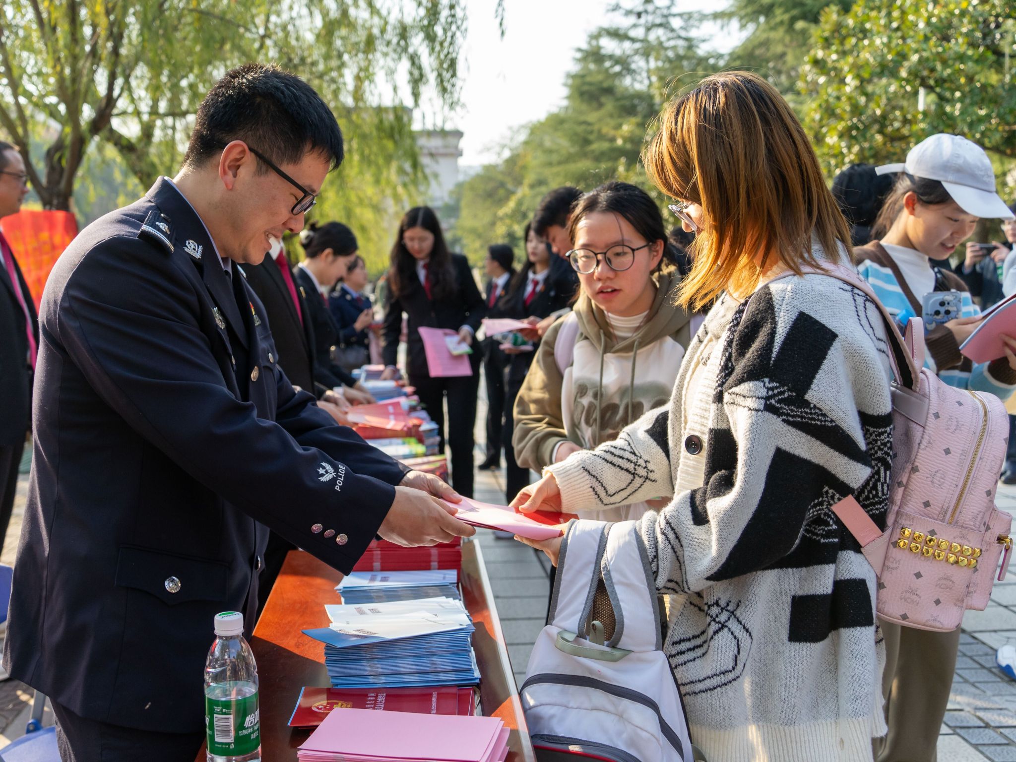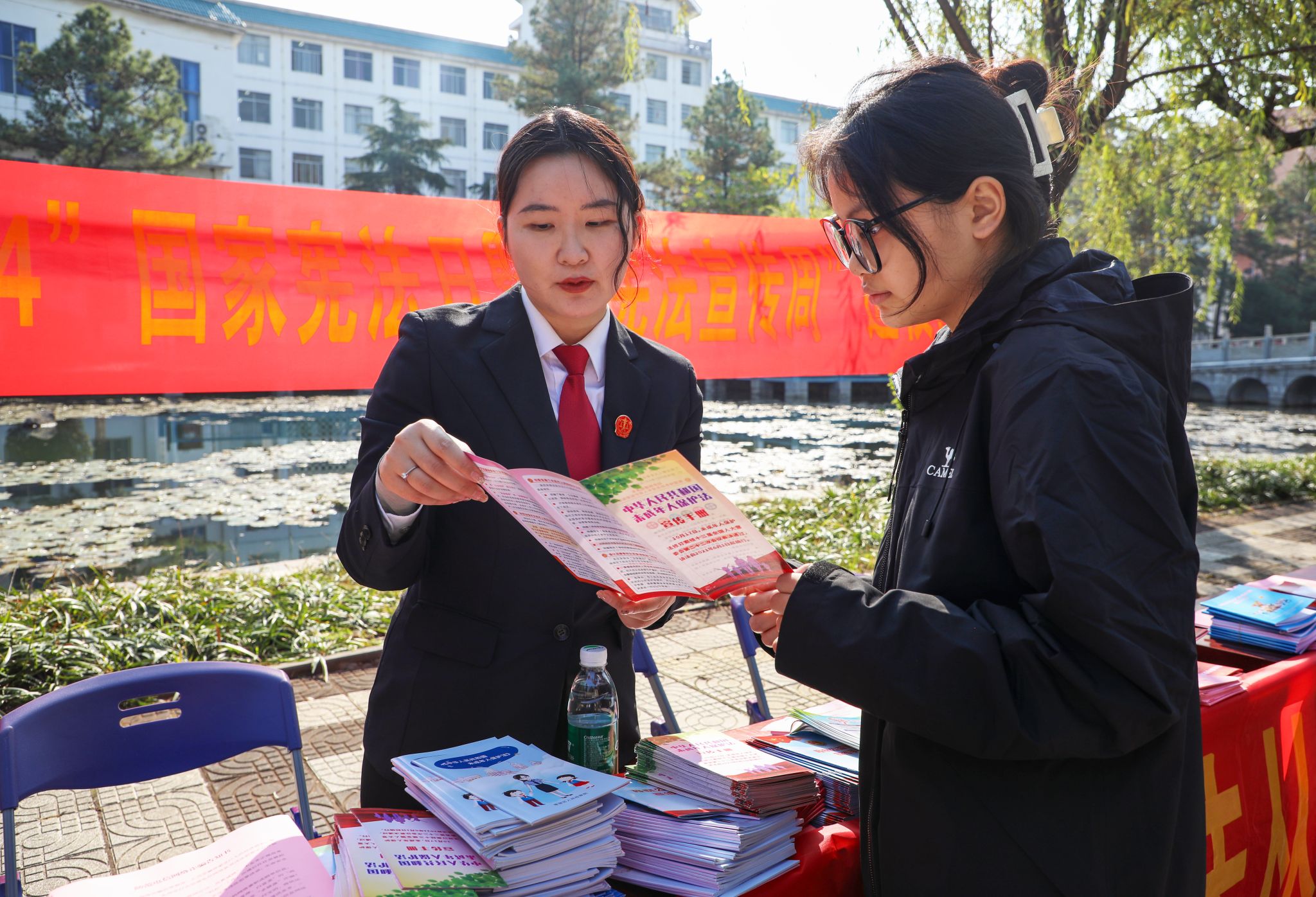 在校园里,工作人员热情地为过往师生发放宪法宣传手册,并解答法律疑问。同时,宪法知识有奖竞答活动也吸引了众多同学参与,同学们通过回答宪法问题,不仅获得了精美礼品,还在趣味答题中深刻理解了宪法在司法实践中的重要作用。