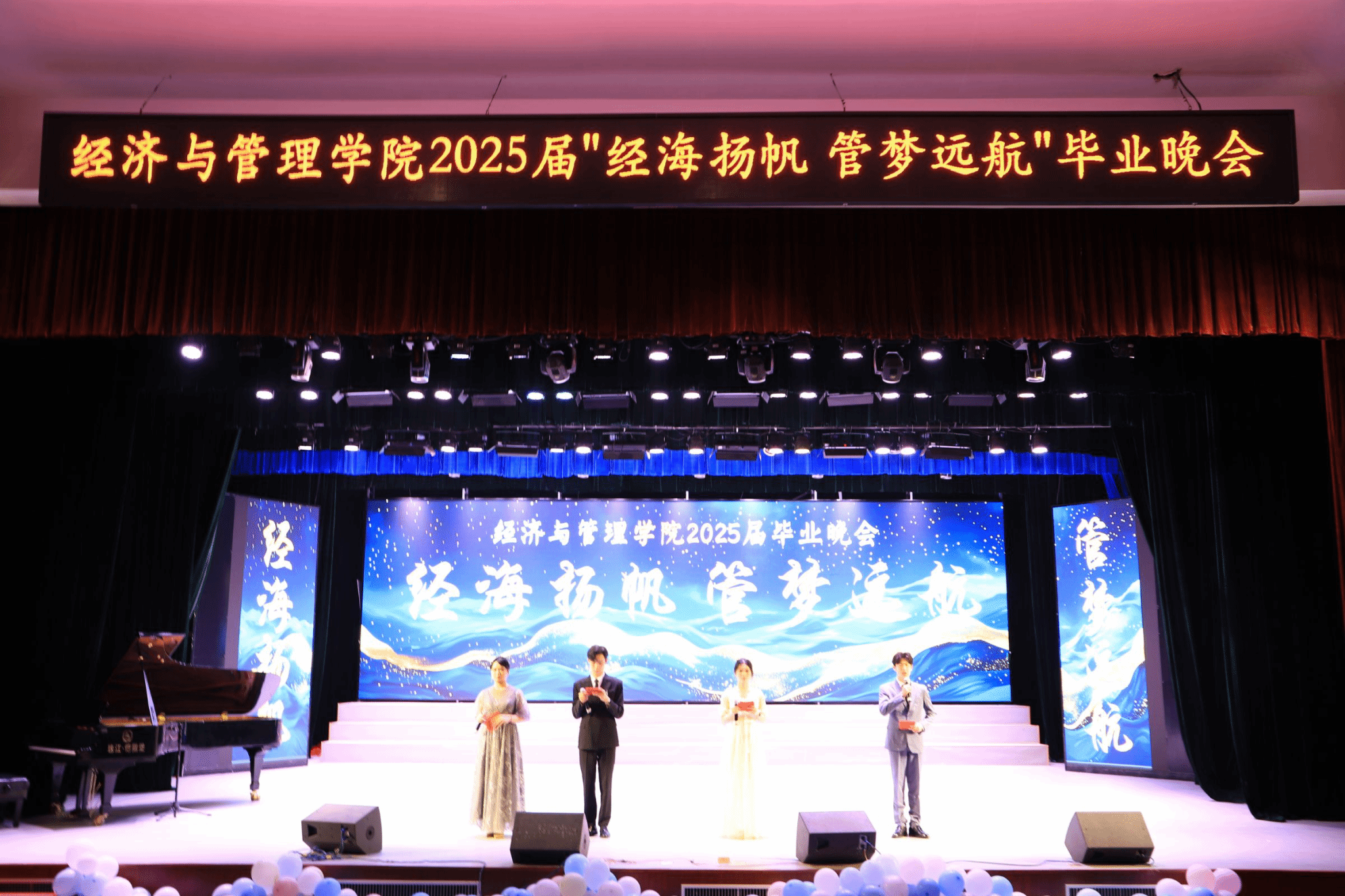 本网讯(通讯员 李晓)5月23日晚,经济与管理学院在大音乐厅举办2025届毕业晚会,活动邀请了相关校领导出席,经济与管理学院相关院领导、辅导员、毕业班师生一同相聚,共赴“盛宴”。