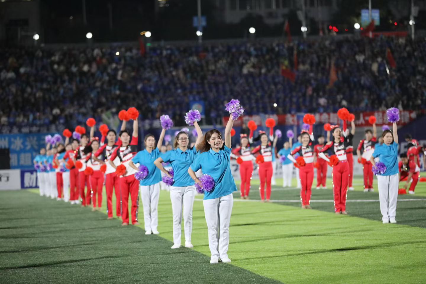 本网讯(通讯员 盘华)10月26日,第七轮湖南省足球超级联赛永州主场对阵长沙,开场前在赛场中央激情上演了一场视觉盛宴,我院盘华、郑华艳和美术与艺术设计学院李国碧老师带领的200多名啦啦操队员用她们充满活力与激情的表演,瞬间点燃了现场球迷的热情。
